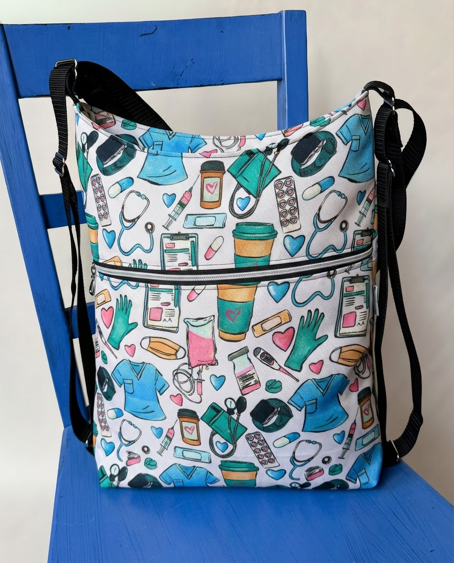 Kabelka má uvnitř dvě kapsy- třeba na Tvou a prckovu láhev s pitím a můžeš si vybrat jak je chceš našít. Pokud nosíš hodně věcí, tablet a nebo sešity A4, určitě zvol kapsy na zadním díle, nebo bez kapes ať Ti kapsy nepřekáží.